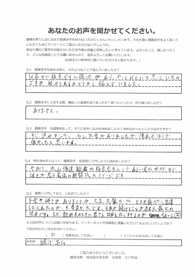 Q1.極真空手を始める前に、どのようなことで悩んでいましたか? A1.以前から極真空手に興味があり、やってみたいと思っていたのですが、続けられるかどうかと悩んでいました。 Q2.極真空手に入会する際、類似した道場を調べましたか?調べたとしたら、何で調べましたか? A2.ありません。 Q3.極真空手 当道場を知って、すぐにお申込みを決めましたか?決めなかったとしたらなぜですか? A3.すぐ決めました。少し不安がありましたが、憧れのほうが強かったと思います。 Q4.何が決め手となって、極真空手 当道場に入門しようと決めましたか? A4.やはり大山倍達総裁=極真空手というある一定の世代なら誰もが思う最強の格闘技のイメージです。 Q5.実際に入門してみて、いかがでしたか? A5.不安や怖さがありましたが、先生、先輩方がとても親切に指導してくれたのが、大変良かったです。それが続けることが出来た最大の理由です。ただ飲み会のときに皆さん羽目を外しすぎるのがちょっと(笑) |